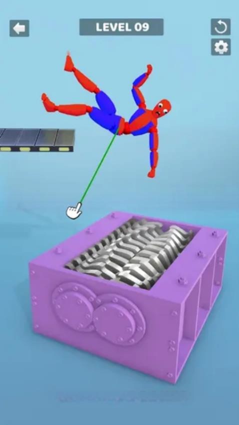 1、在【LEVEL-09】,操控绿色线条移动角色,避开紫色粉碎机,安全到达上方平台。