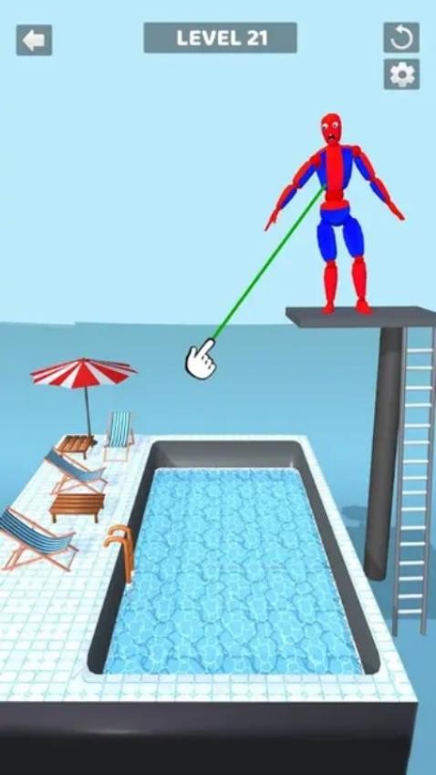 3、在【LEVEL-21】,用绿色线条引导角色到泳池边,规划路径,完成关卡任务。