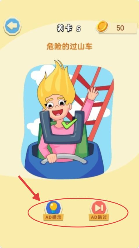 2、【关卡-5】中,检查过山车安全(如系安全带,图中对勾),按提示操作,可AD跳过广告,体验过山车场景。