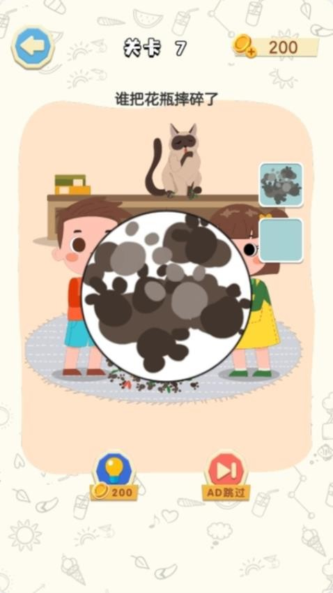 3、【关卡-7】时,清理污渍(用金币提示或AD跳过),观察孩子和猫,推理谁打碎花瓶(如猫在桌旁),完成任务。