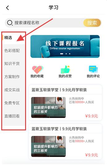1、打开应用,进入【学习】页面,点击左侧【精选】栏,进入课程分类选择环节。