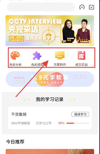 2、切换界面后,点击【色彩搭配】等功能按钮(如色彩分析、方案制作),开启对应学习模块。
