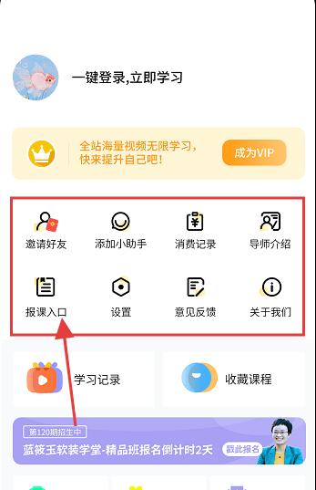 3、进入个人中心相关页,点击【报课入口】,按提示完成操作,完成课程报名任务。