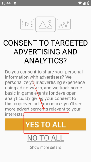 1、同意广告和分析同意书:阅读并同意分享个人信息的同意书,点击“YES TO ALL”以接受广告和分析。