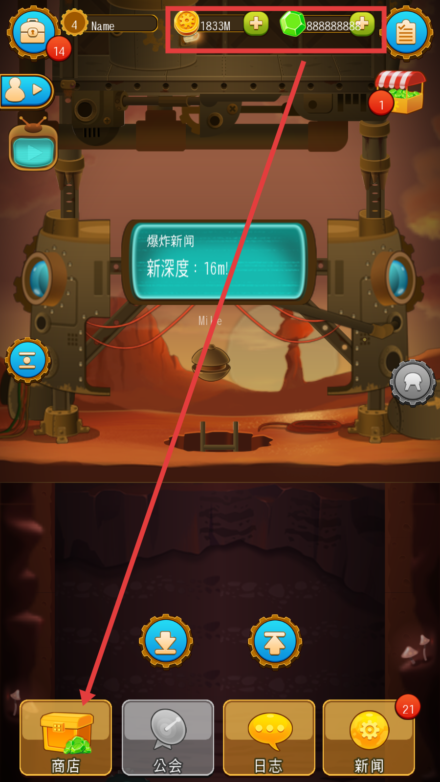 1、进入游戏,优先查看上方货币(金币、绿宝石),点击【商店】用货币购买挖矿增益道具。