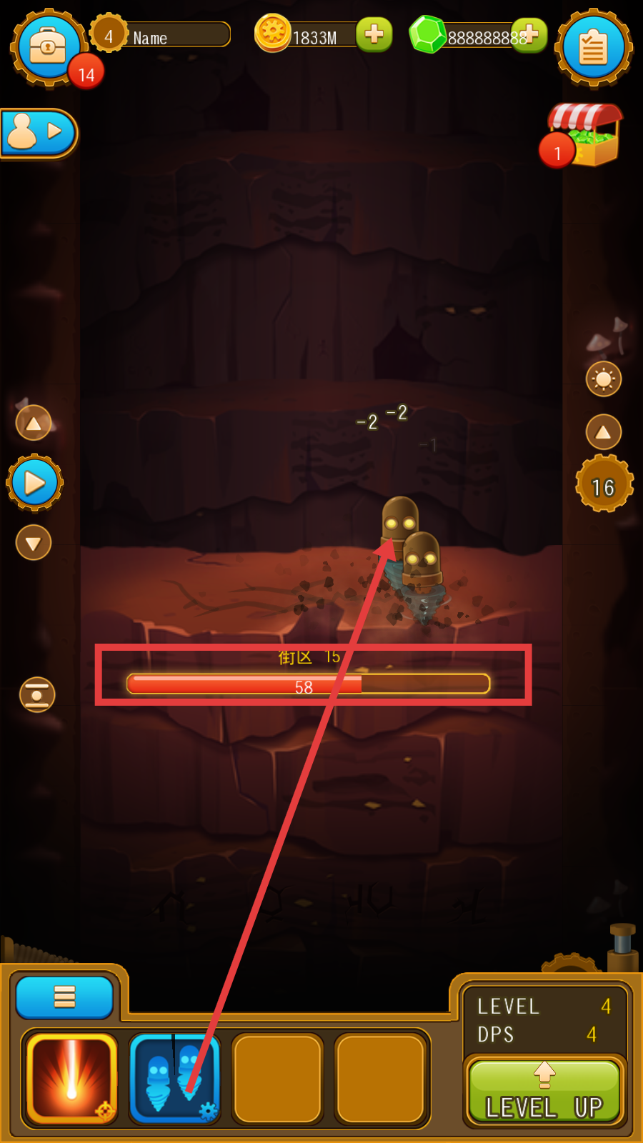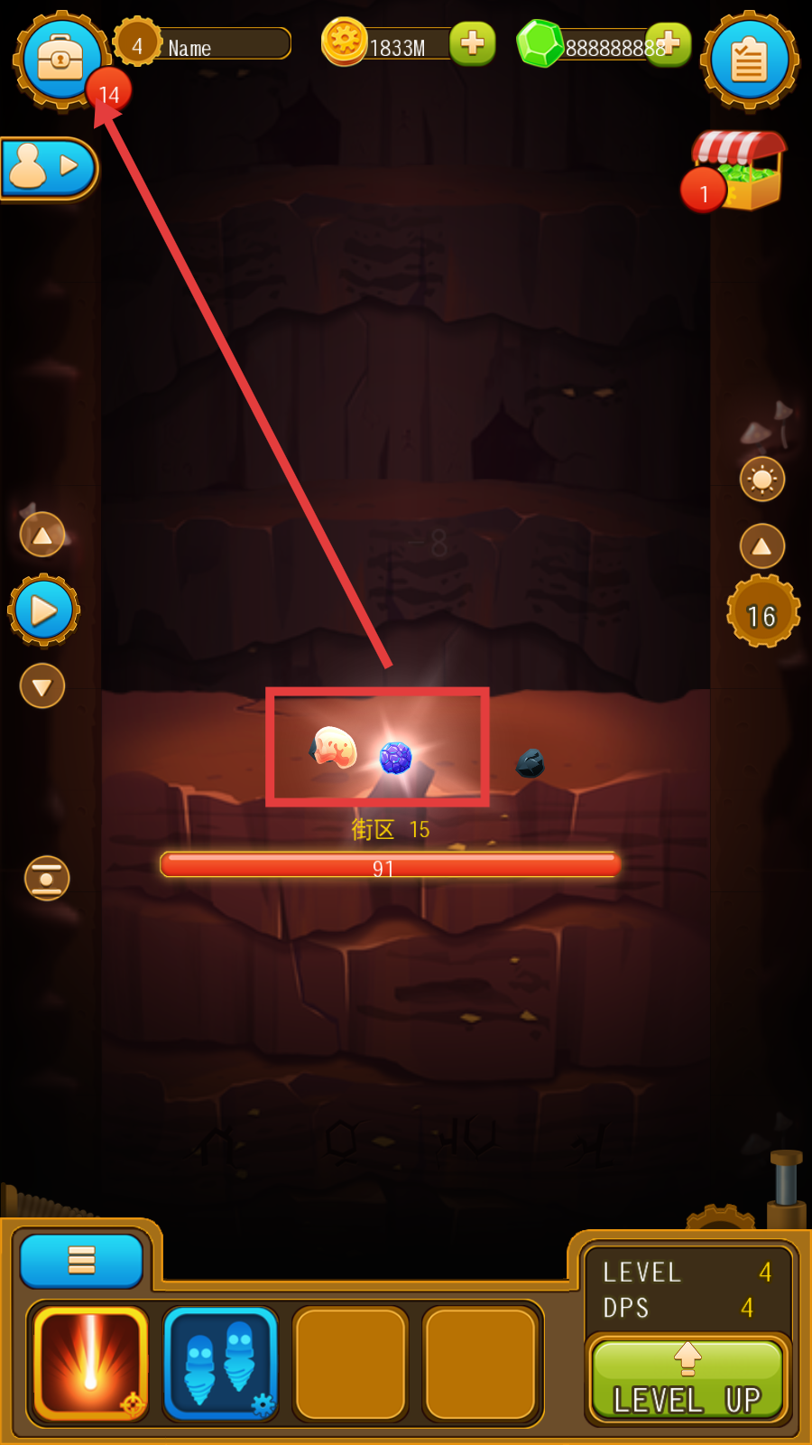 2、挖矿时,遇到发光矿石(如街区15的彩色矿石)点击采集,积累资源,留意左上角提示(如数字14),及时处理。