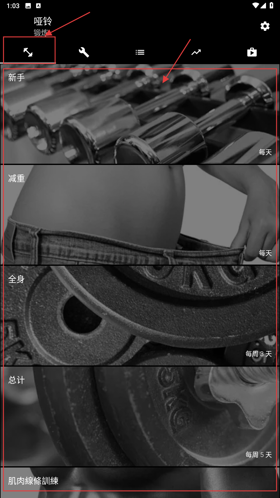 1、打开应用,在【哑铃锻炼】界面选择训练计划(新手、减重等),进入计划选择操作环节。
