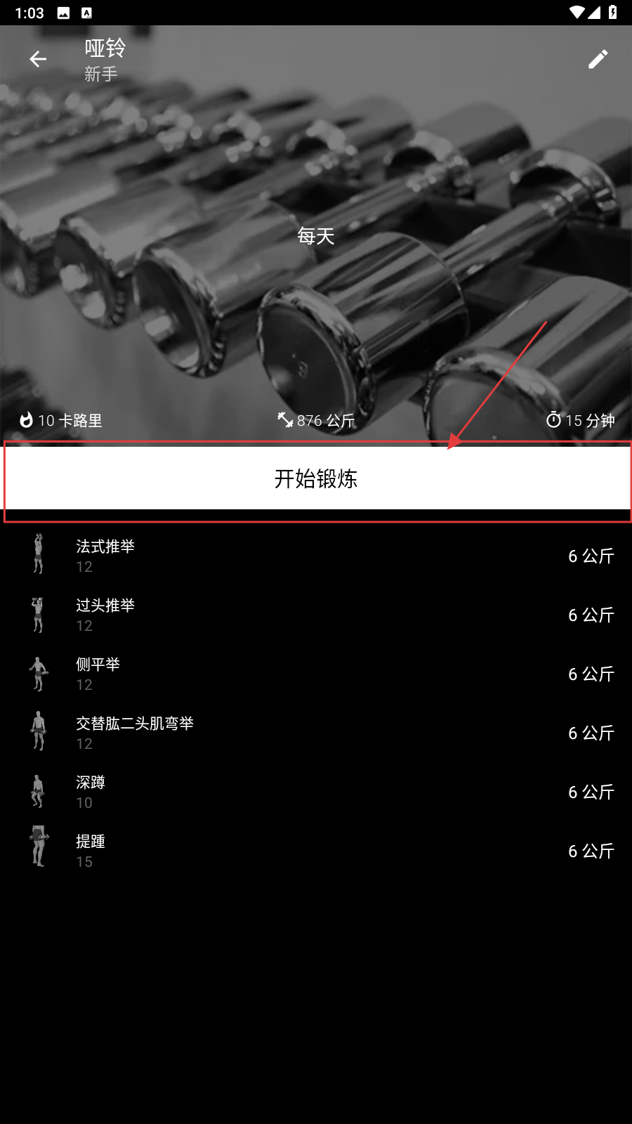 2、点击计划进入详情页,确认动作列表,点击【开始锻炼】,开启锻炼流程。