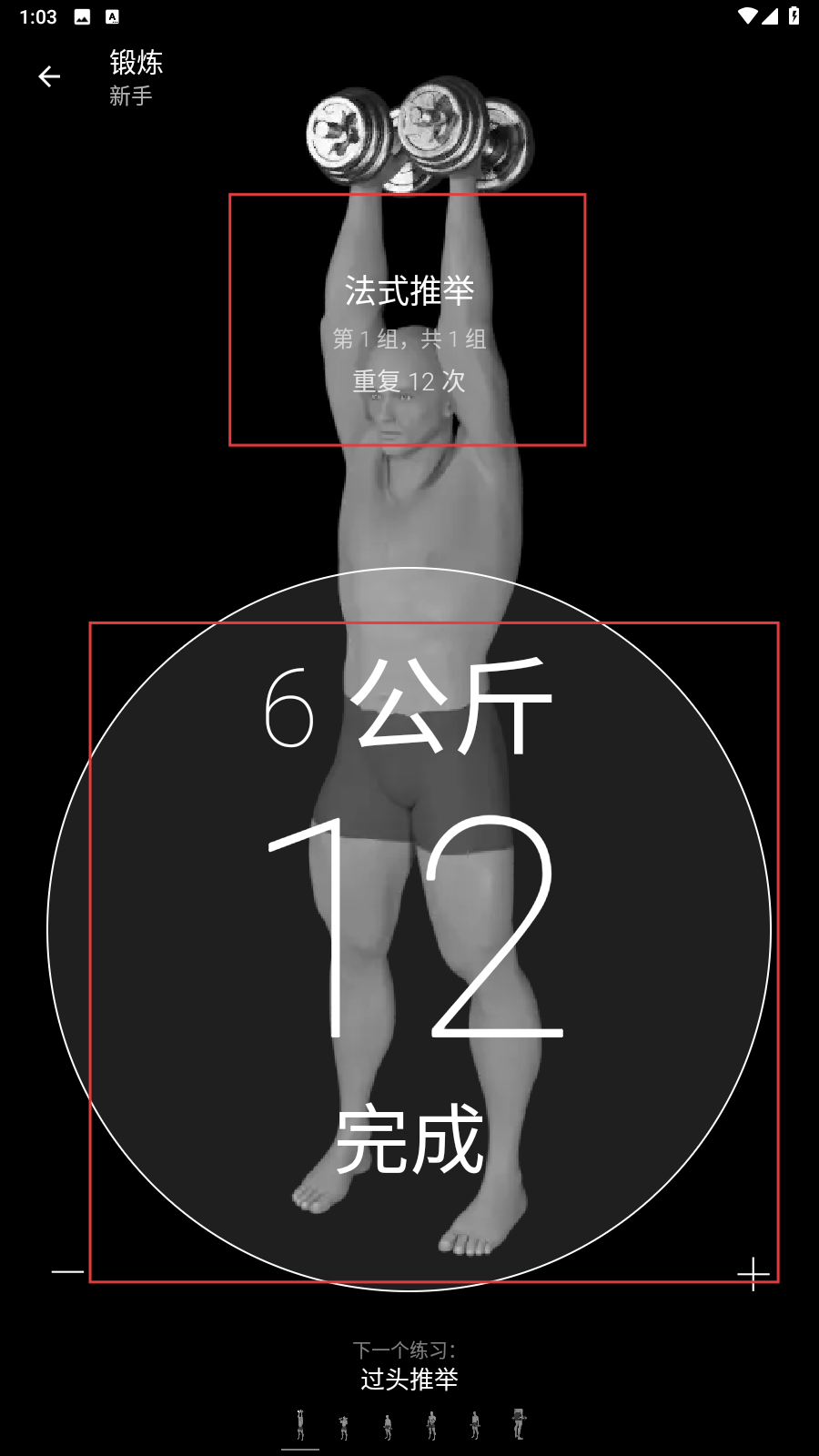 3、进入锻炼页面,按指引完成动作(法式推举等),完成一组训练任务。