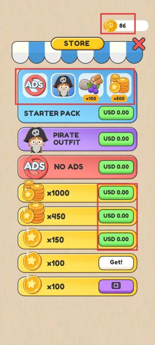 3、进入商店(STORE),可利用现有金币,选择带有【USD0.00】的道具或金币包购买,也可通过对应图标获取福利,提升资源与能力。