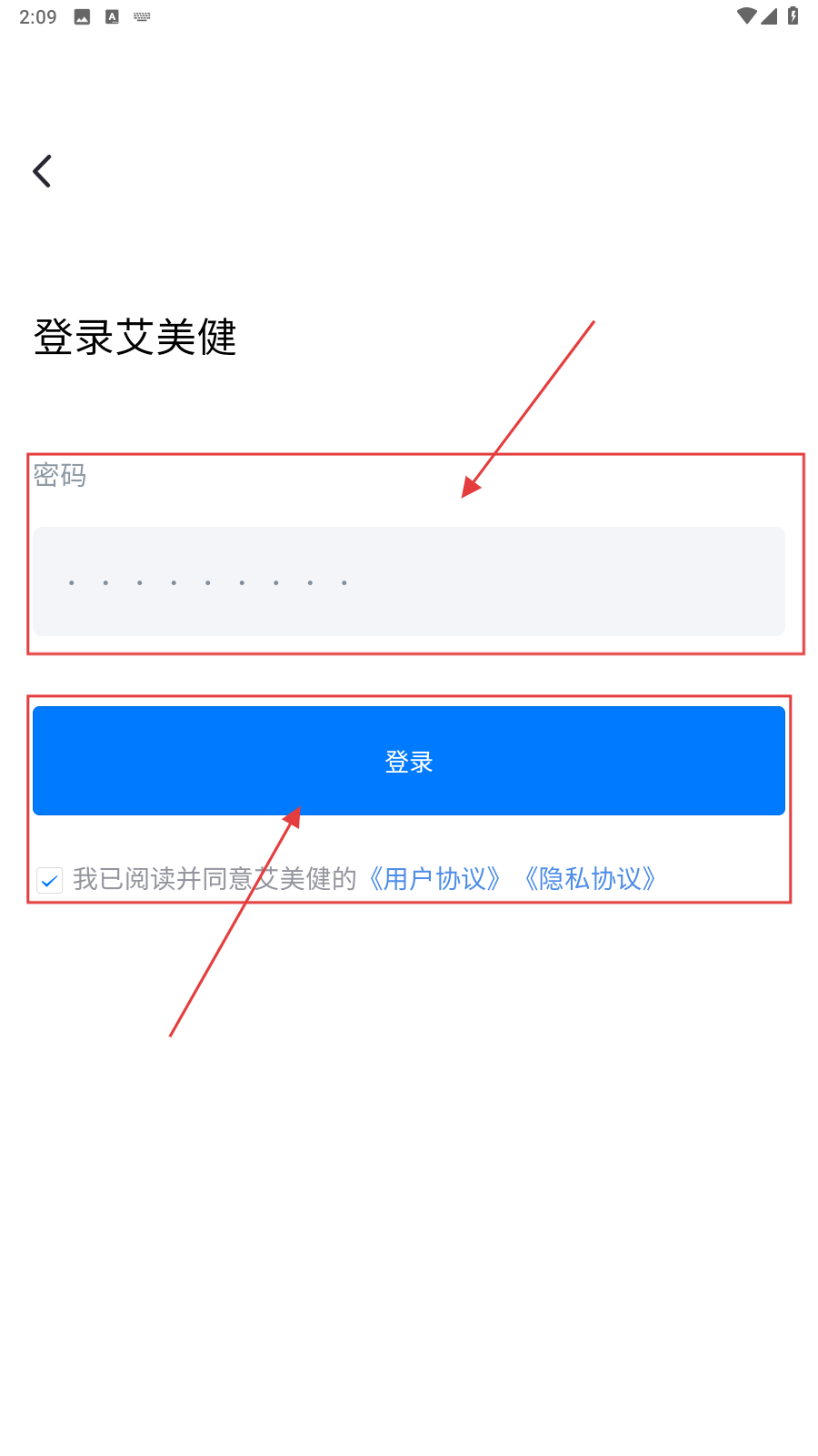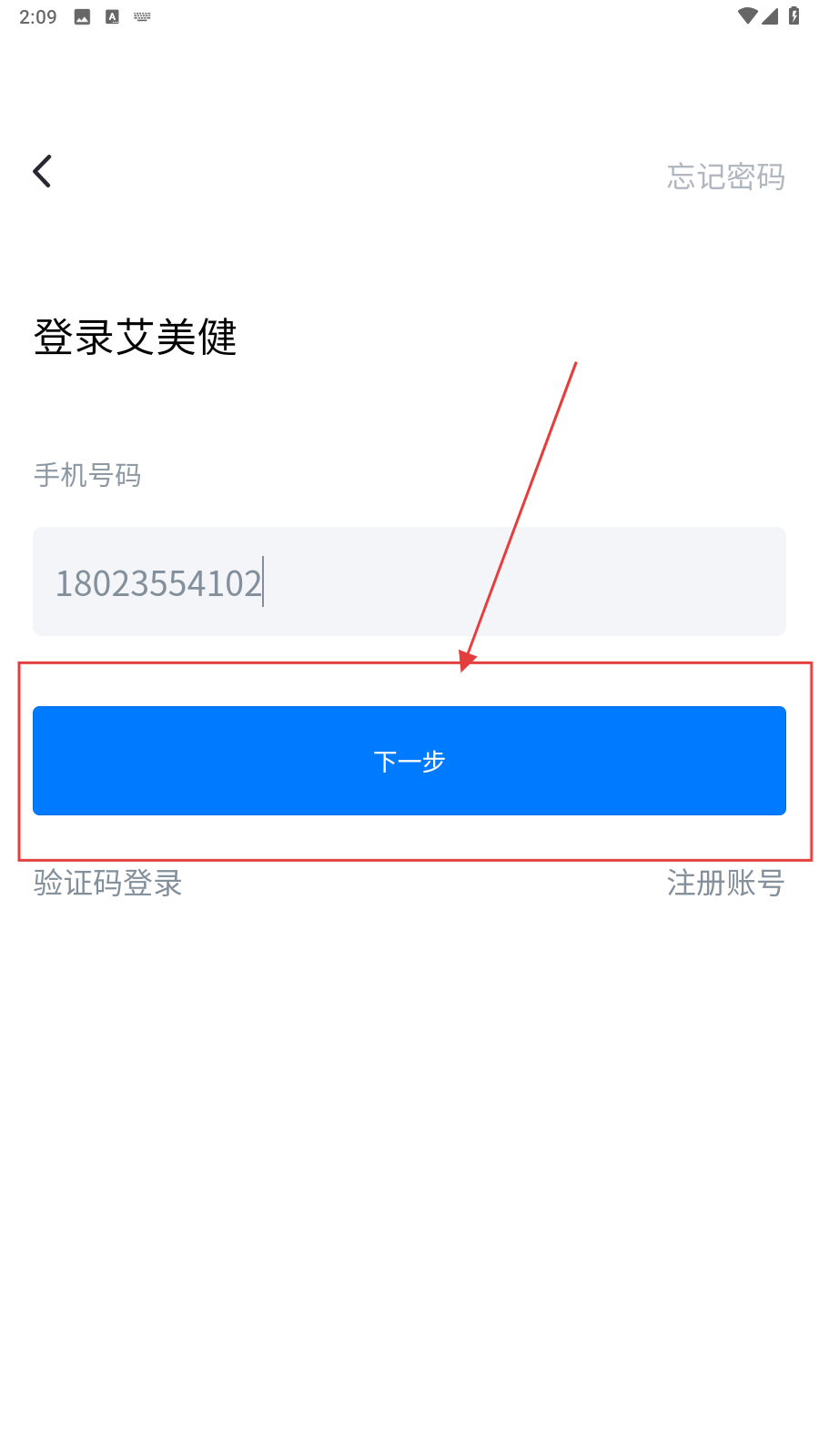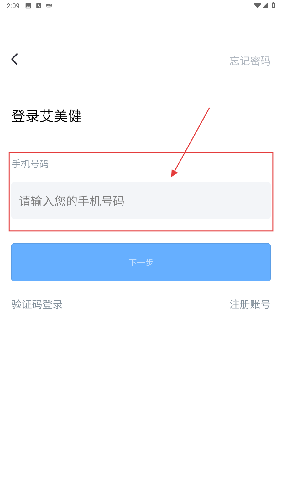 1、打开应用,在【登录艾美健】页点击【请输入您的手机号码】框,录入手机号。