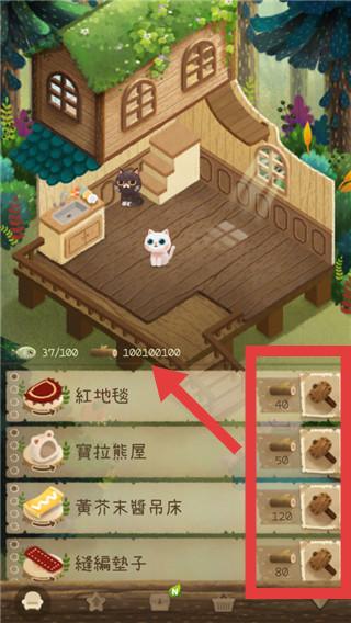 3、在屋内用右侧锤子等道具,消耗材料升级“红地毯”等家具,打造家园。