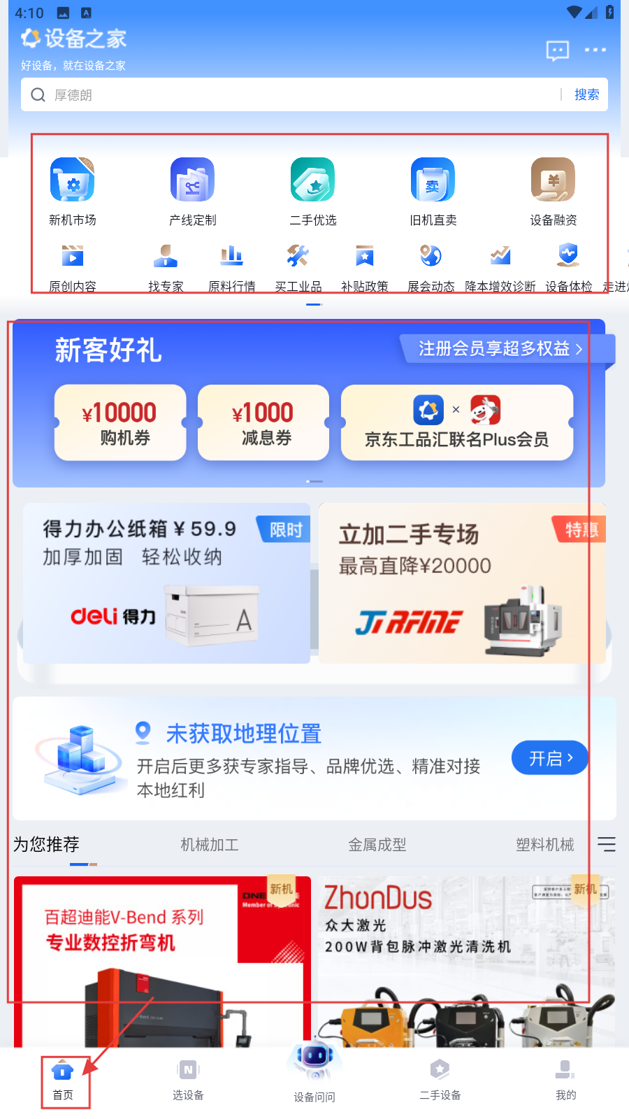 1、打开应用,在【首页】浏览功能(新机市场、二手优选等)及优惠活动,点击【选设备】进入选设备页。