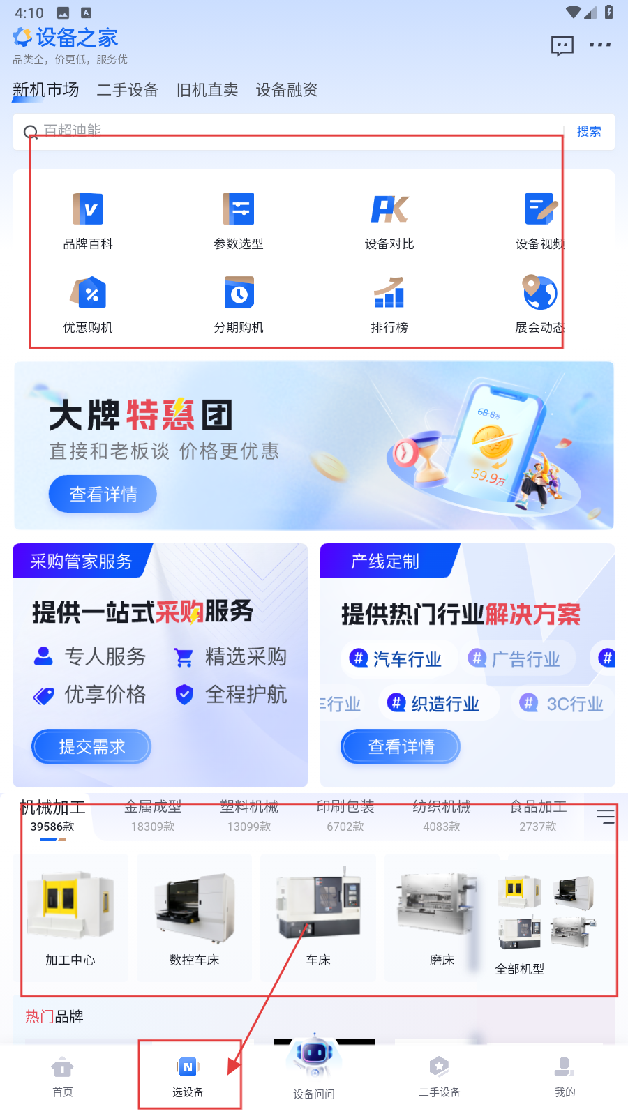 2、在【选设备】页选分类(品牌百科、参数选型等),浏览设备(机械加工、金属成型等机型),点击【二手设备】进入二手设备页。