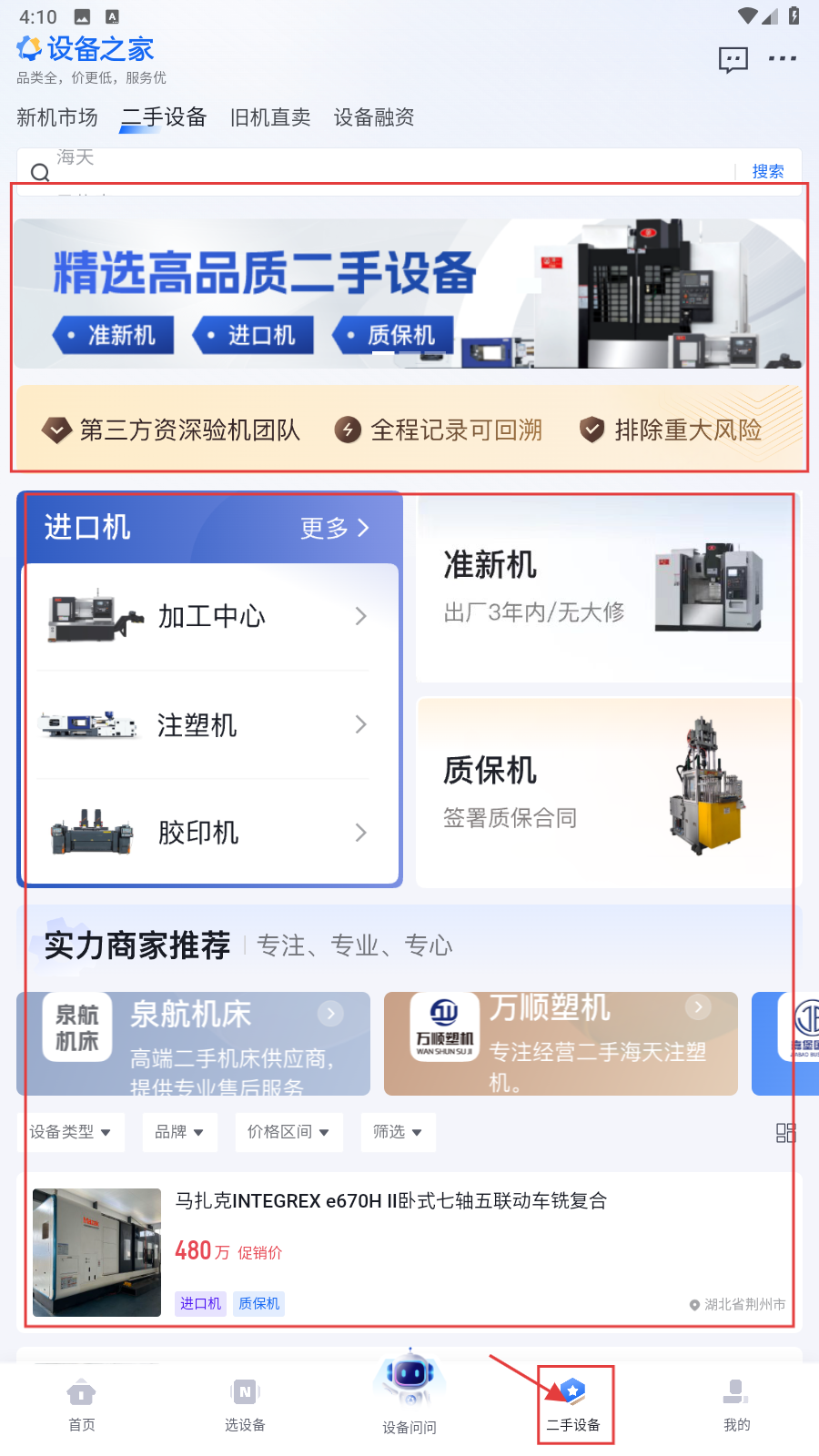 3、在【二手设备】页查看精选二手设备(准新机、进口机等)、商家推荐,完成设备浏览/采购相关任务。