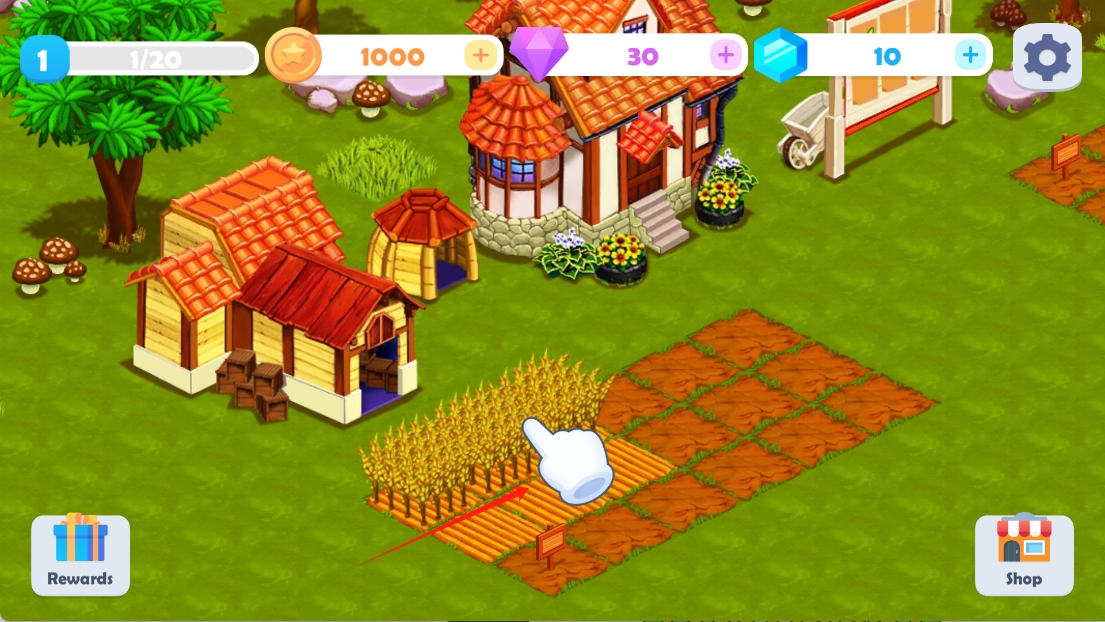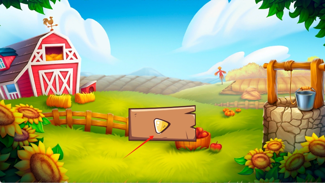 1、点击箭头指示的木牌,获取游戏提示和任务,开始你的农场经营之旅。