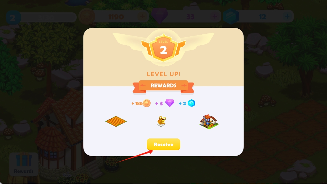 3、点击“Receive”按钮,领取升级奖励,包括金币、钻石和新建筑,提升农场等级。