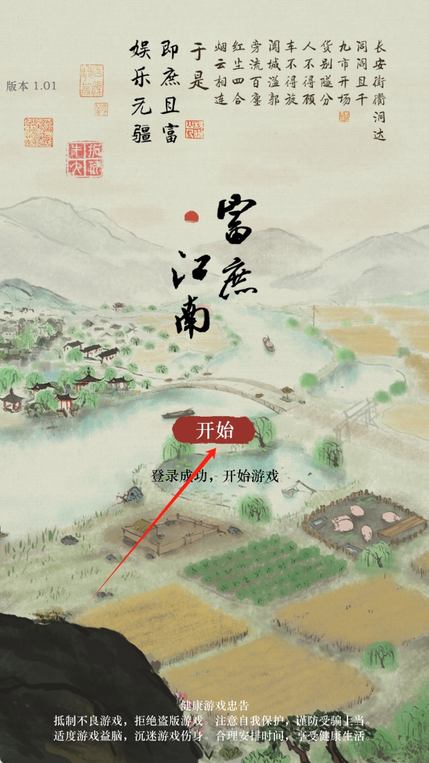 1、点击“开始”按钮,进入游戏,开始你的江南地区的模拟经营之旅。