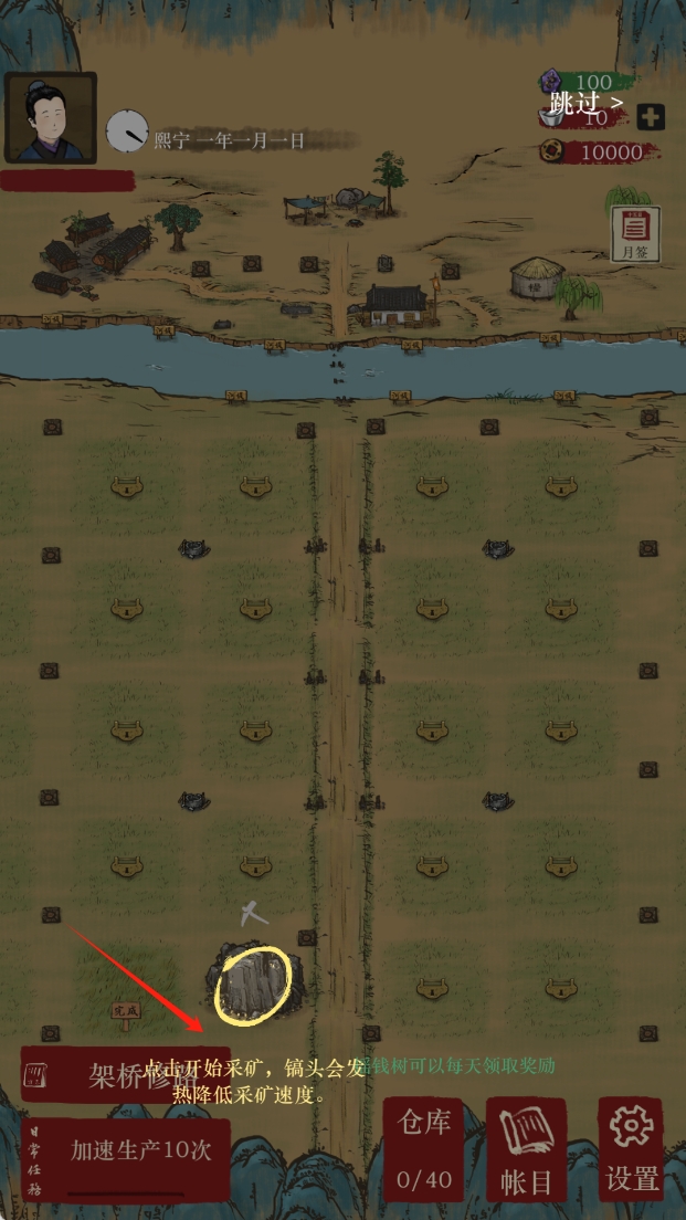 2、点击地图上的矿点,开始采矿,利用发钱树获取奖励,降低采矿速度。