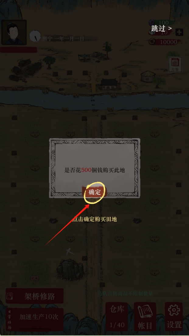 3、点击“确定”按钮,花费500铜钱购买田地,扩展经营规模,增加收入来源。
