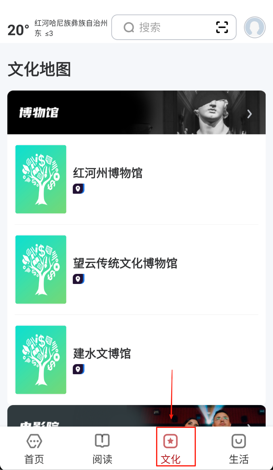 2、通过文化地图模块查看周边博物馆、医院等场馆信息,并启动导航前往体验。