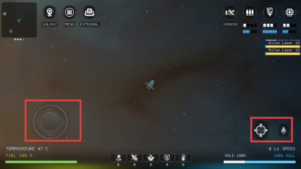2、通过左侧圆形虚拟摇杆控制飞船移动,利用右侧瞄准和推进按钮进行瞄准与加速操作。