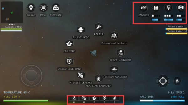 3、熟悉上方功能按钮、右侧武器按钮及中间区域功能选项,根据情况使用相应功能,同时关注飞船状态数值。