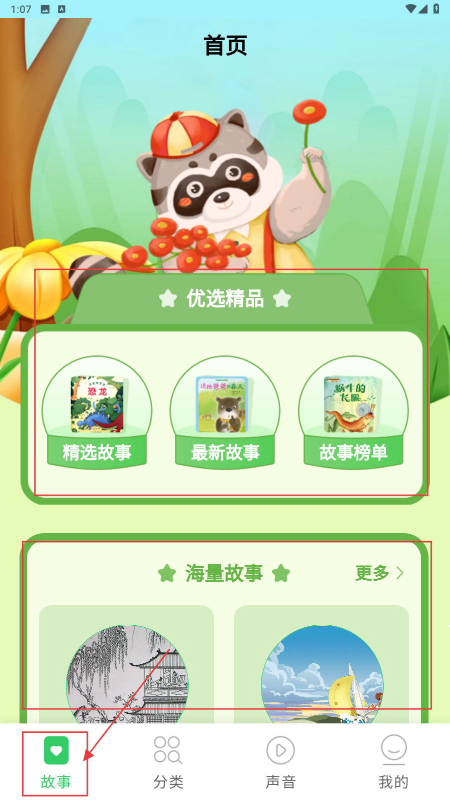 1、打开应用,在【故事】页,可选“优选精品”(精选故事等)或“海量故事”。