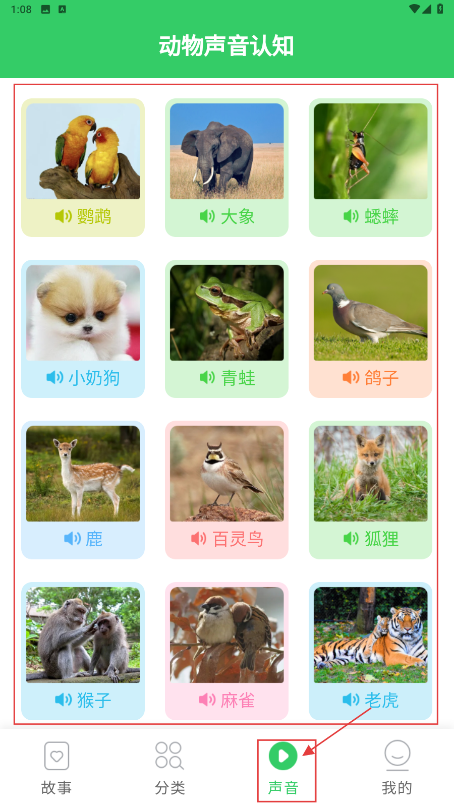 3、点【声音】,进入“动物声音认知”页,可播放鹦鹉、大象等动物声音,辅助儿童认知。