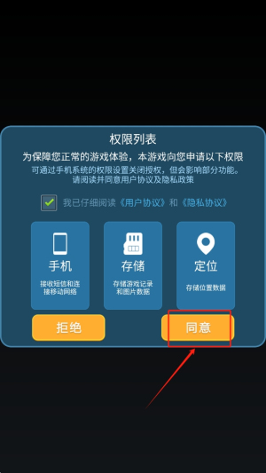 1、同意权限:点击“同意”按钮,授权游戏所需的手机权限,以便正常进行游戏。