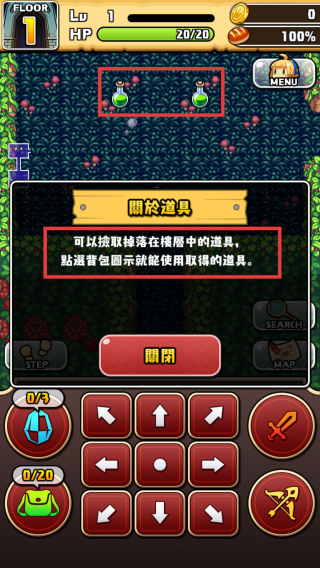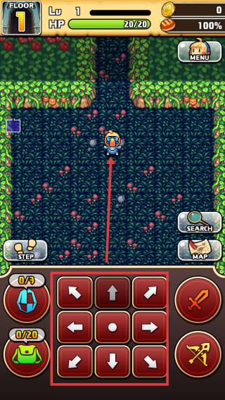 1、进入游戏,留意角色状态信息(楼层、等级、生命值等),通过底部方向键控制角色移动。