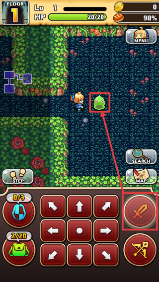 3、遇到怪物时,点击右侧攻击按钮(剑图标)进行战斗,探索楼层推进冒险。