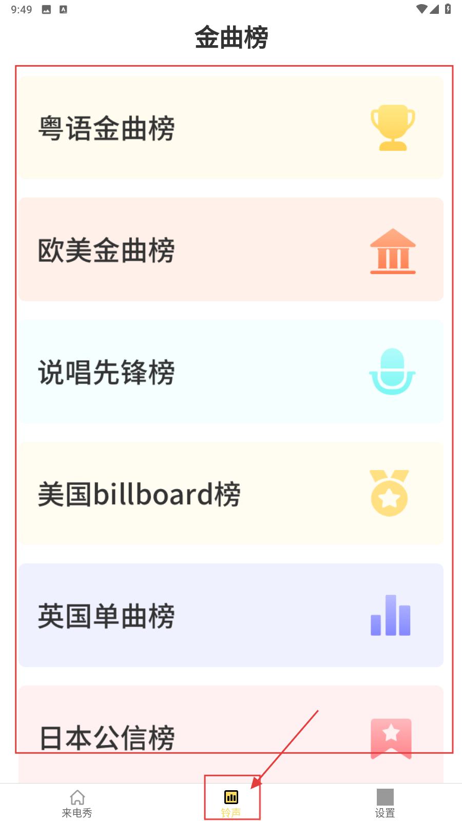 3、点【铃声】,选金曲榜分类(粤语、欧美等),还能设置来电铃声。