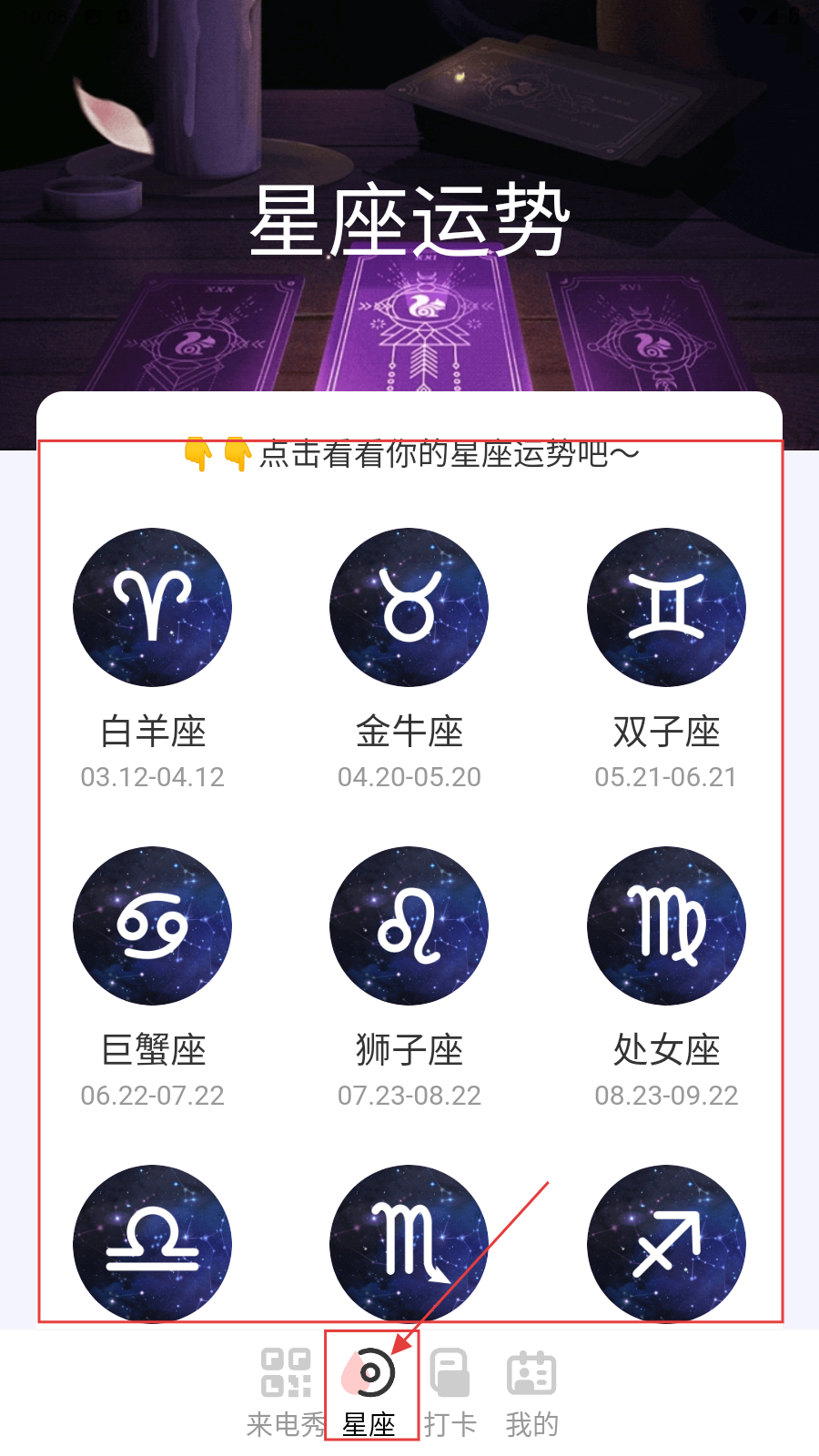 3、点【星座】,选星座(白羊、金牛等),查看运势。