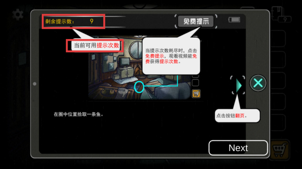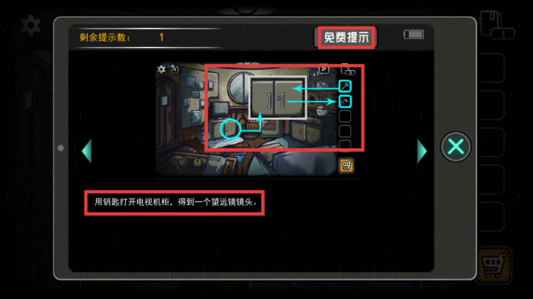1、游戏中遇到解谜困难时,可利用【免费提示】功能。初始有一定数量的提示次数,点击相应提示可获取线索。
