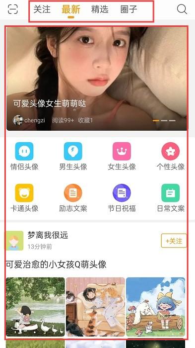 1、在首页,通过【关注】【最新】等板块,浏览头像【情侣头像】【男生头像】、文案【励志文案】【日常文案】等内容。