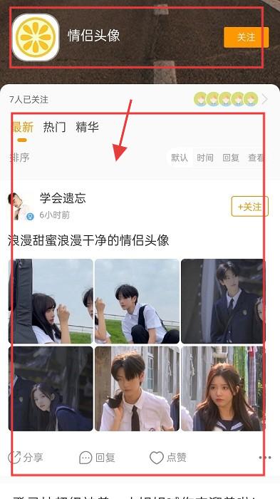 2、点【情侣头像】分类,查看用户分享的情侣头像及相关文案。