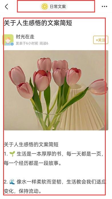 3、选【日常文案】分类,阅读发布的人生感悟等文案,还可关注创作者。