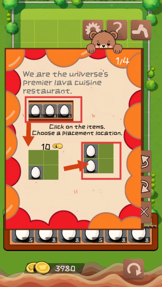 1、点击屏幕下方的物品(如蛋),选择绿色方格放置。注意物品上的数字(如5、8、6),合理规划布局。
