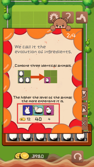 2、将三个相同的动物(从蛋孵化而来)合并,可进化出更高级动物,级别越高价值越高(如兔子价值12金币、绵羊价值40金币)。