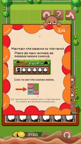 3、维持牧场平衡,在烹饪前尽量多放置动物。点击烹饪后的菜品出售,满足订单需求,获取金币(当前3980),推动游戏发展。