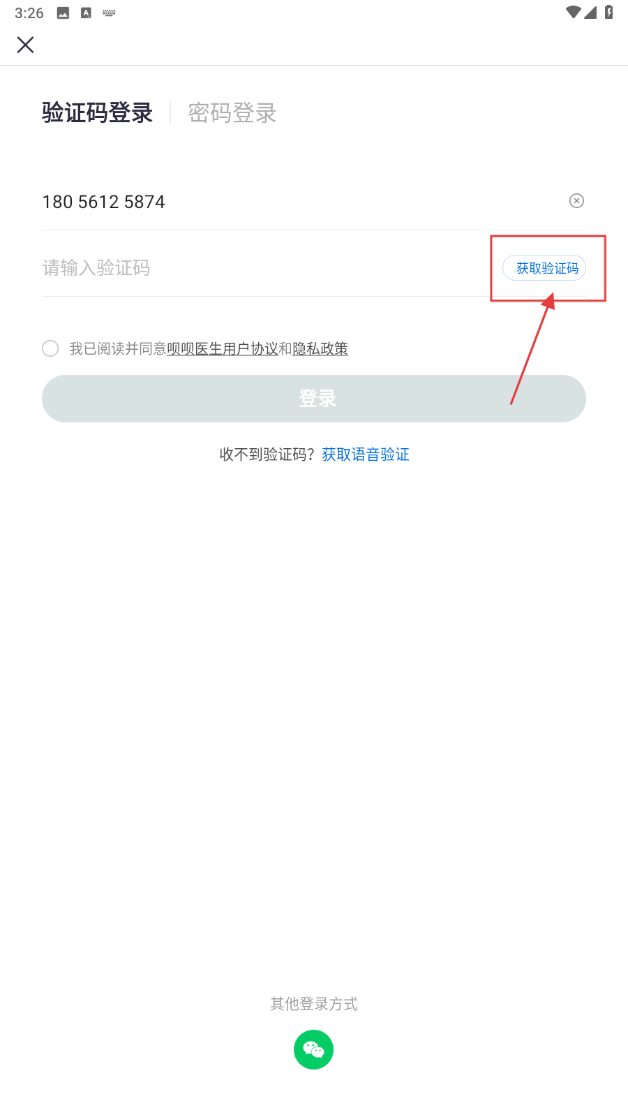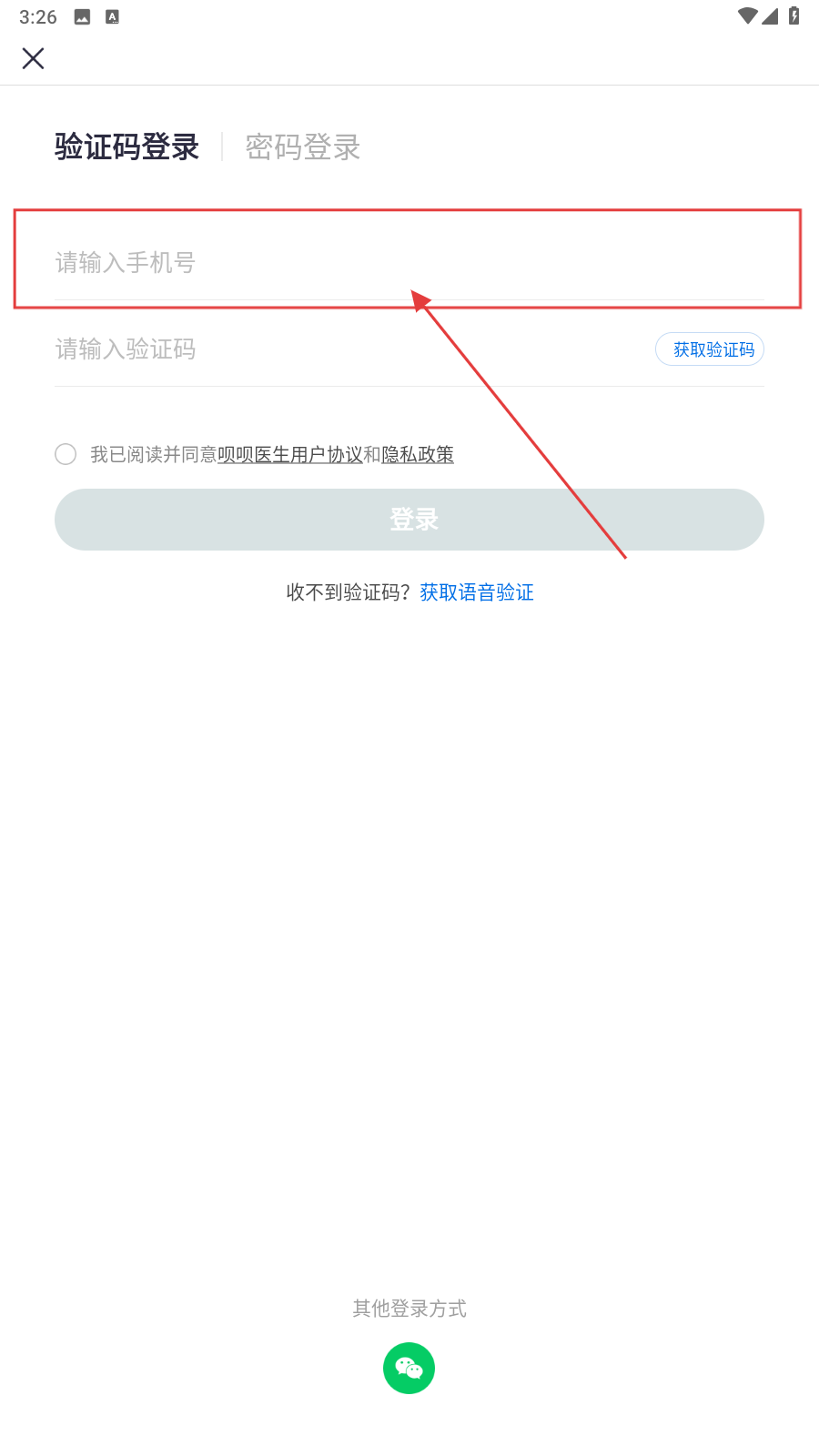 1、打开应用,填写手机号。