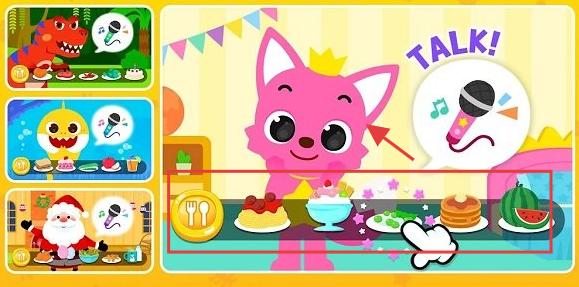 3、进入互动模块,如粉色小猫场景,可点食物互动,还有唱歌(TALK!标识)等功能,左侧有恐龙、鲨鱼等不同主题互动区。
