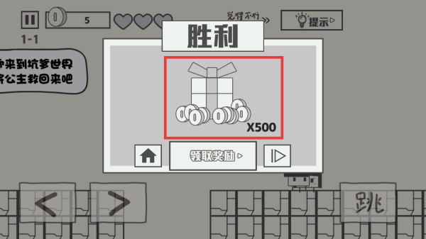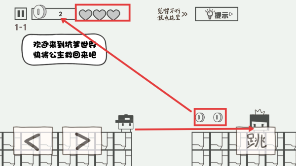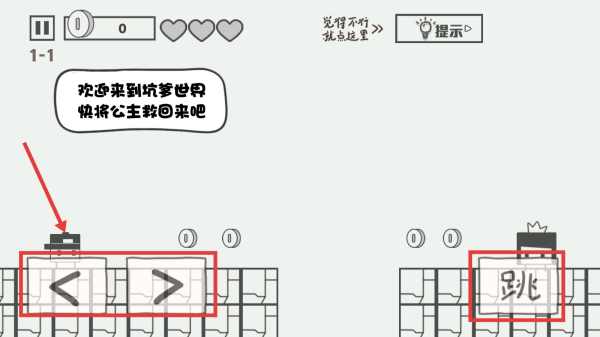 1、注意屏幕下方的【<】【>】方向键和【跳】键,合理利用它们操控角色移动和跳跃。