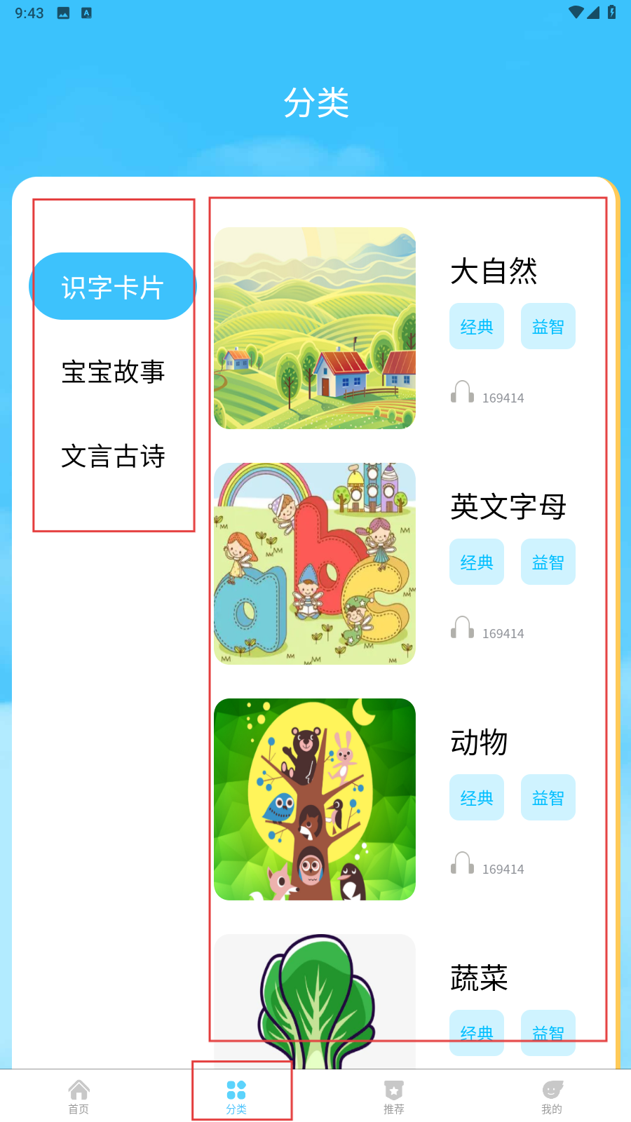 2、点【分类】,选“识字卡片、宝宝故事”等分类,进入“大自然、英文字母”等内容页。