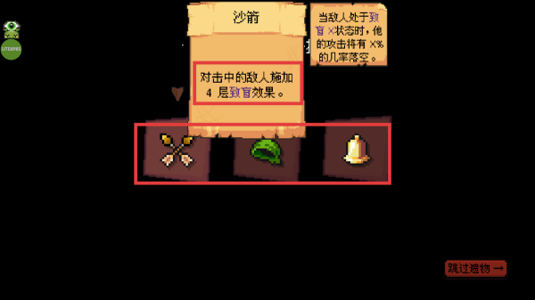 2、在遗物选择时,优先选取【沙箭】,它能对击中敌人施加4层致盲效果,使敌人攻击有几率落空,提升战斗优势。