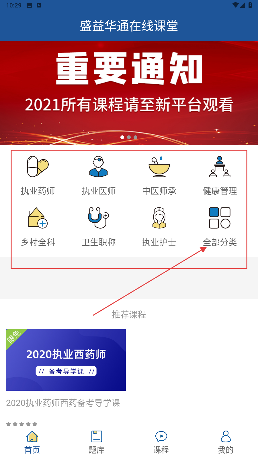 1、在【首页】,点“全部分类”,浏览执业药师、医师等课程分类。