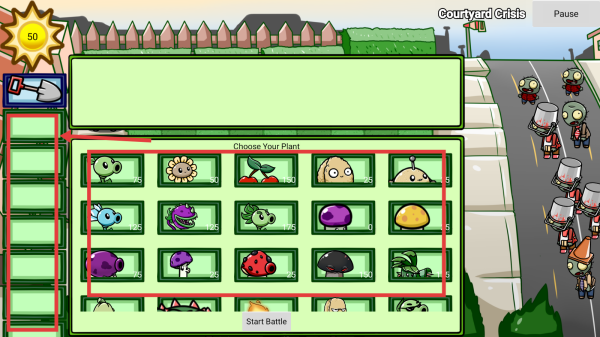 1、在植物选择界面,根据左上角的阳光数量,结合不同植物的阳光消耗(如豌豆射手75、向日葵50等),合理挑选植物用于防御僵尸。