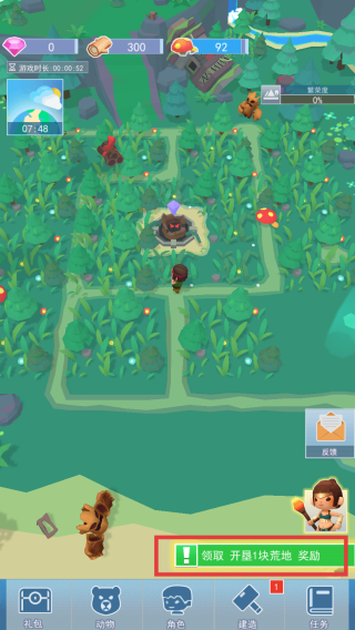 2、完成开垦荒地任务后,留意屏幕下方提示,及时点击【领取开垦1块荒地奖励】,获取相应资源奖励。