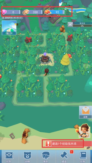 3、关注屏幕上方资源数值(钻石、木材、食物等),根据【建造1个初级伐木场】等任务提示,合理规划资源进行建筑建造,推动游戏进程。